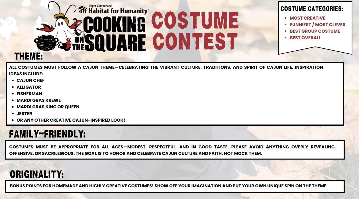 Get Ready for a Cajun-Inspired Costume Contest! As part of this year’s Cooking on the Square celebration, Upper Cumberland Habitat for Humanity invites you to join our Costume Contest, a vibrant, fun-filled competition! THEME: Get inspired by characters like a Cajun chef, alligator, fisherman, Mardi Gras king or queen, or even a jester. Feel free to get creative and show off your own unique Cajun-inspired twist! FAMILY-FRIENDLY FUN: This is an all-ages event, so please keep costumes modest, respectful, and appropriate. ORIGINALITY COUNTS: Homemade and creative costumes are highly encouraged! Judges will award bonus points for imagination, craftsmanship, and originality, so don’t be afraid to think outside the box! COSTUME CATEGORIES: Most Creative, Funniest / Most Clever, Best Group Costume, Best Overall Bring your best Cajun flair and join the fun! Whether you're stirring the gumbo or showing off your costume on the square, this contest is sure to spice up the day.