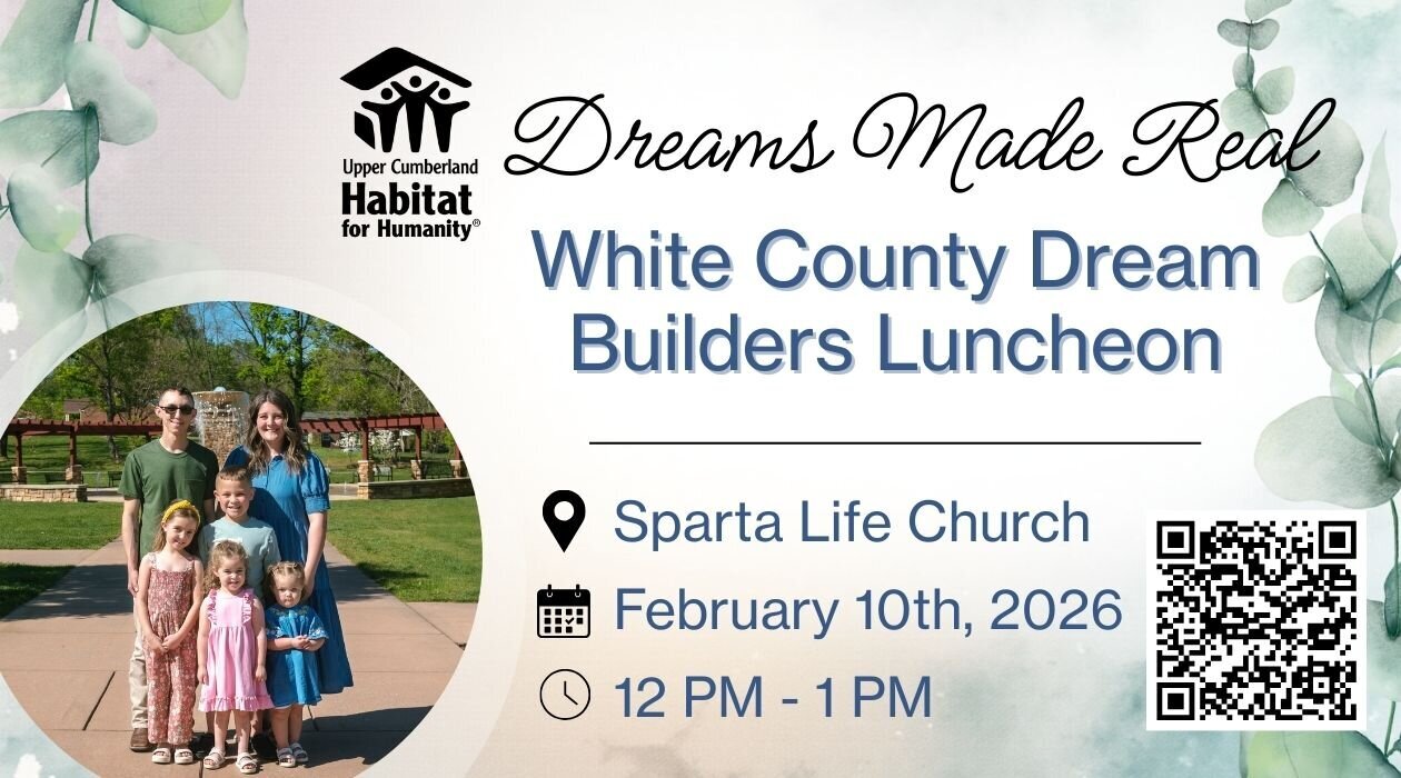 Join us February 10, 2026, from 12 PM โ1 PM at Sparta Life Church for the White County Dream Builders Luncheon, an inspiring event supporting Upper Cumberland Habitat for Humanity. Enjoy a BBQ pork lunch from Frankโs while hearing powerful homeowner, volunteer, and donor stories that show how dreams of stable housing become reality. Learn how your support helps build homes, change lives, and strengthen our community. ๐ Tickets: $20 individual | Table Host: $250 (8 seats, recognition included) ๐ Location: Sparta Life Church, 427 W Bockman Way, Sparta, TN ๐ Donations welcome When we build together, we build stronger. We canโt wait to see you there! |